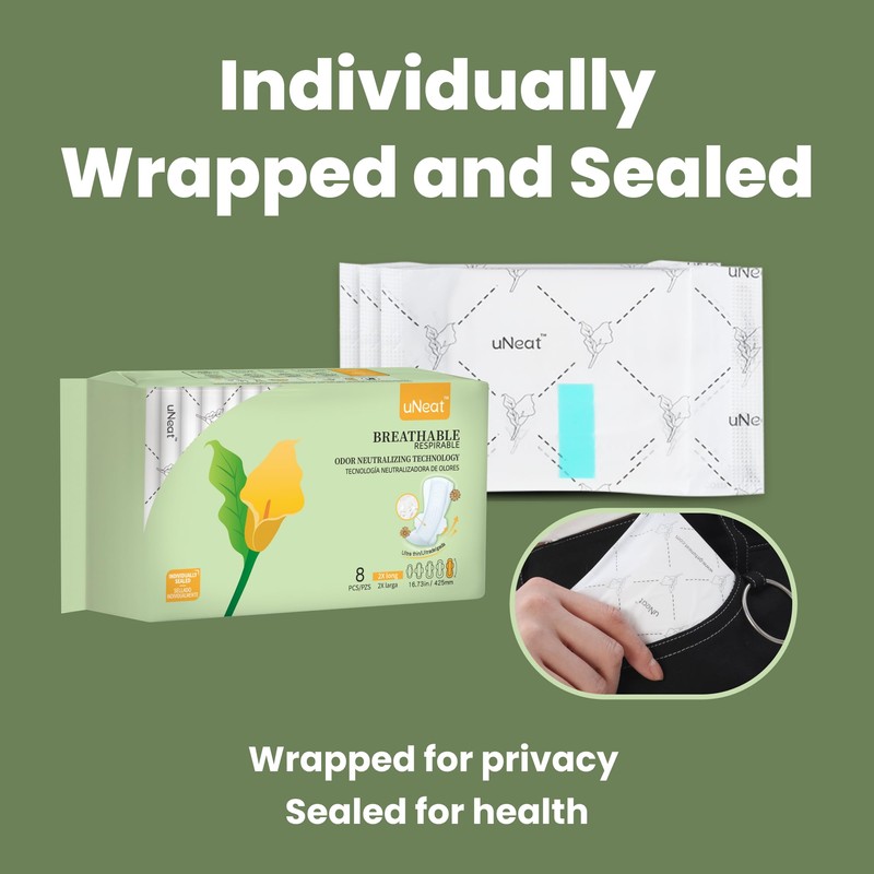 uNeat Ultra Thin Breathable Feminine Pads with Wings for Women, Odor-Neutralizing Tech, Unscented, Heavy, Extra Heavy Absorbency, Overnight (2X Long, 8 Count)