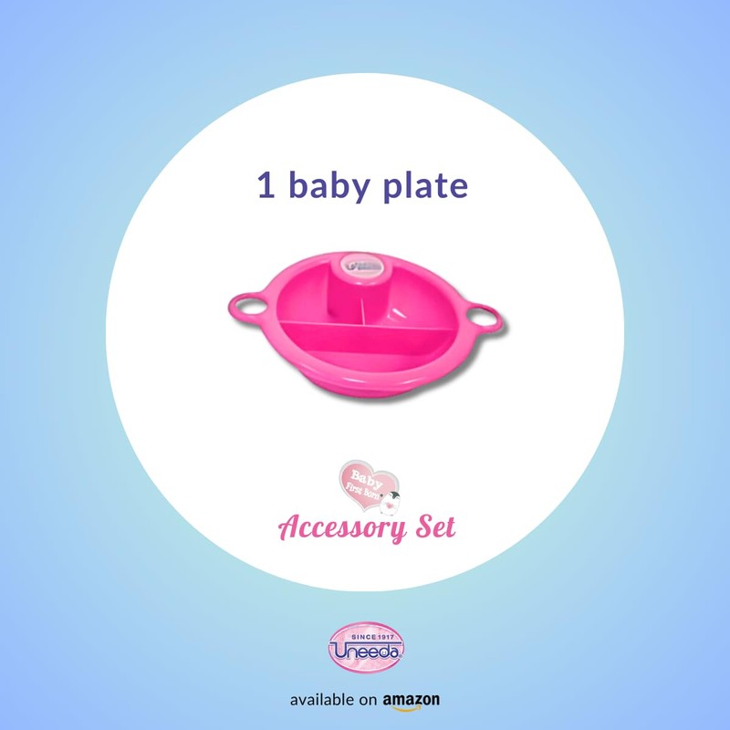 - 9-Piece Baby Doll Accessories Set – Includes two baby bottles, a bib, a fork and spoon, a food dish, a pacifier, and two baby food jars.
