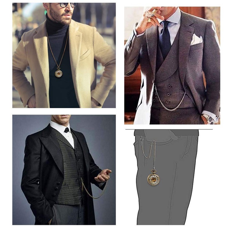 - ♦ Package includes: 1 x Mehanian pocket watch (watch size: diameter: 4.7 cm, thickness: 1.3 cm, weight: 90 g); 1 x 37.5 cm standard pocket watch chain (14.5 inches), 1 x long sweater chain: 80 cm (31.5 inches), 1 x gift bag with the brand name: Unendlich U jewellery. With pocket watch chain for men who wear a shirt or Can be attached to the hose