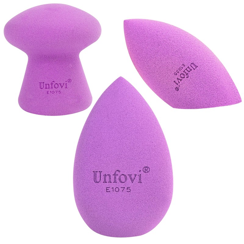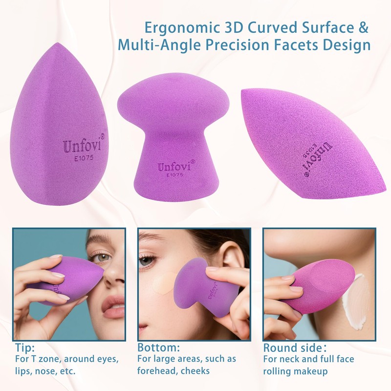 Unfovi 3-Piece Makeup Sponge Set - Latex-Free Blending Sponges for Liquid & Powder, Reusable Face Beauty Sponges with Ergonomic Shapes (Rounded, Mushroom, Angled Tip) (Purple)