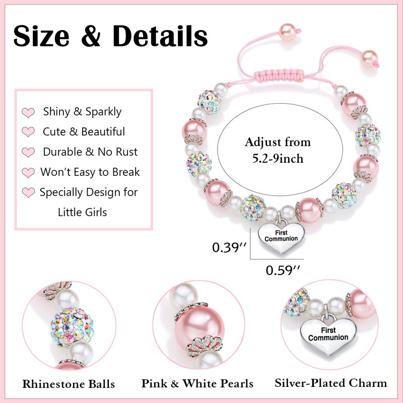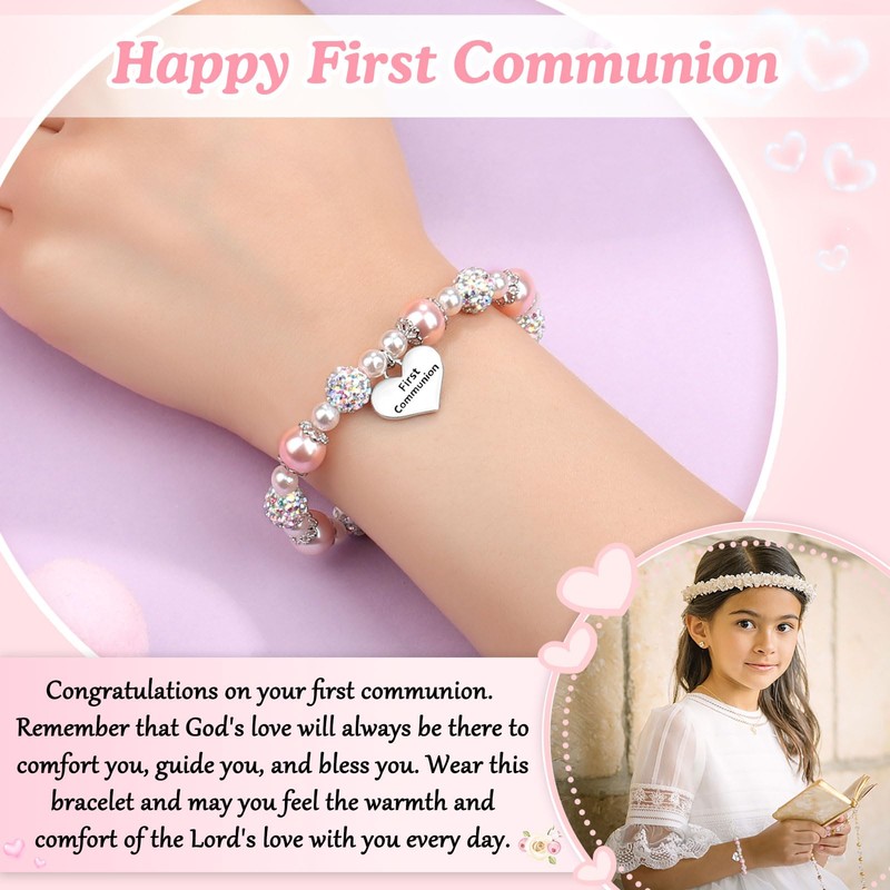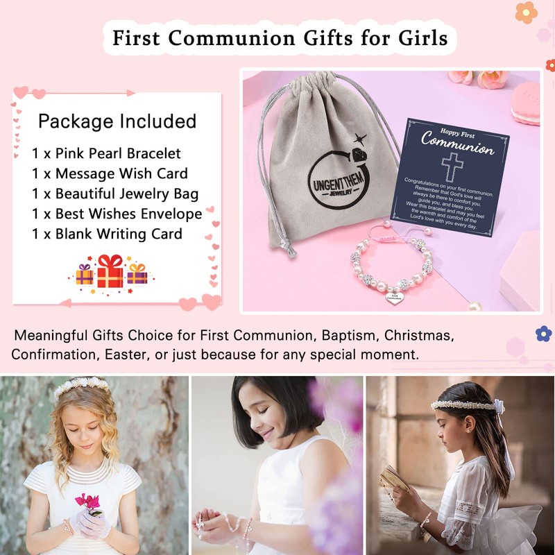 - 【 First Communion Gifts for Girls】 -- The sparkly & lovely pearl bracelet comes with a card and a blank greeting card in a little jewelry bag. You can write some special wishes. A perfect present for granddaughter, goddaughter, and niece on the First Communion, Baptism, Christmas, Confirmation, Easter, or just because for any special moment.