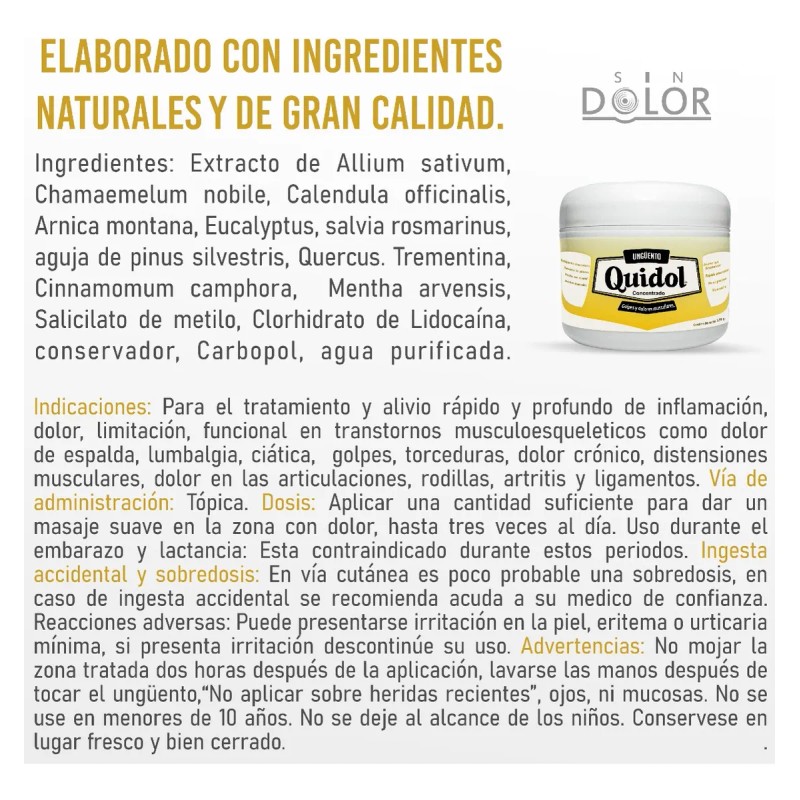 [ Ciática: ] La ciática, que se caracteriza por dolor que irradia desde la parte baja de la espalda hasta las piernas, puede ser aliviada con Quidol gracias a su acción analgésica y antiinflamatoria.