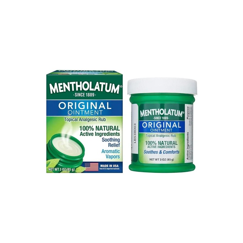 Ingredientes activos 100% naturales: la pomada original de mentolatum ofrece alcanfor natural (9%) y mentol (1,3%) en una fórmula única que es única diferente de otros roces tópicos. Su fórmula penetrante ayuda a aliviar dolores menores de músculos y articulaciones, además de los vapores naturales son relajantes para las fosas nasales.