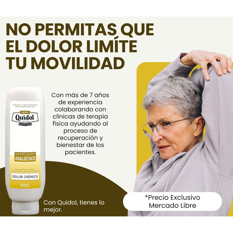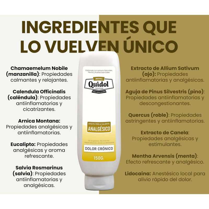 Quidol es más que un simple ungüento tópico; es tu solución integral para el alivio del dolor muscular y articular. Su fórmula concentrada y potente actúa rápidamente para reducir la inflamación, calmar el dolor y mejorar tu calidad de vida. Ya sea que sufras de dolores crónicos, lesiones deportivas o simplemente necesites un poco de alivio después de un día agotador, Quidol está aquí para ayudarte a enfrentar el dolor con confianza. Con ingredientes naturales y un efecto frío y caliente reconfortante, Quidol te ofrece una experiencia de alivio del dolor sin igual. No permitas que el dolor te detenga; ¡ordena tu Quidol hoy mismo y recupera tu bienestar! [ INGREDIENTES ] 1. Extracto de allium sativum: Conocido por sus propiedades antiinflamatorias y analgésicas, el extracto de ajo ayuda a reducir la inflamación y calmar el dolor. 2. Chamaemelum nobile (manzanilla): Con propiedades calmantes y relajantes, la manzanilla alivia el malestar muscular y articular. 3. Calendula officinalis (caléndula): Con propiedades antiinflamatorias y cicatrizantes, la caléndula ayuda a reducir la hinchazón y promover la curación de la piel. 4. Arnica montana: Conocida por sus propiedades analgésicas y antiinflamatorias, el árnica alivia el dolor y reduce la inflamación en músculos y articulaciones. 5. Eucalipto: Con un aroma refrescante y propiedades analgésicas, el eucalipto proporciona alivio al dolor muscular y articular. 6. Salvia rosmarinus (salvia): Con propiedades antiinflamatorias y analgésicas, la salvia ayuda a reducir la inflamación y aliviar el dolor. 7. Aguja de pinus silvestris: Con propiedades antiinflamatorias y descongestionantes, el extracto de pino alivia la congestión muscular y mejora la circulación. 8. Quercus (roble): Con propiedades astringentes y antiinflamatorias, el roble ayuda a reducir la inflamación y promover la curación de la piel. 9. Trementina: Conocida por sus propiedades analgésicas y antiinflamatorias, la trementina alivia el dolor y reduce la inflamación en músculos y articulaciones. 10. Extracto de canela: Con propiedades analgésicas y estimulantes, la canela ayuda a aliviar el dolor muscular y mejorar la circulación. 11. Mentha arvensis (menta): Con un efecto refrescante y analgésico, la menta alivia el malestar muscular y proporciona una sensación de frescura. 12. Salicilato de metilo: Con propiedades analgésicas y antiinflamatorias similares a la aspirina, el salicilato de metilo alivia el dolor y reduce la inflamación en músculos y articulaciones. 13. Lidocaína: Un anestésico local que ayuda a bloquear las señales de dolor en los nervios, proporcionando un alivio rápido y efectivo. [ PREGUNTAS FRECUENTES ] -- ¿Cuánto tiempo tarda en hacer efecto Quidol? R: Quidol suele proporcionar un alivio rápido del dolor, con efectos que pueden sentirse minutos después de su aplicación. Sin embargo, la duración del alivio puede variar según la persona y la gravedad del dolor. -- ¿Cuántas veces al día puedo aplicar Quidol? R: Puedes aplicar Quidol según sea necesario, hasta 6 veces al día. -- ¿Es seguro usar Quidol junto con otros medicamentos? R: Si estás tomando otros medicamentos o tienes alguna condición médica preexistente, es recomendable consultar con un profesional de la salud antes de usar Quidol para evitar posibles interacciones o efectos secundarios. -- ¿Puedo usar Quidol durante el embarazo o la lactancia? R: Si estás embarazada, amamantando o planeas quedar embarazada, es recomendable consultar con tu médico antes de usar Quidol, ya que algunos de sus ingredientes pueden no ser recomendables en estas circunstancias. -- ¿Quidol es apto para niños? R: Quidol no está formulado específicamente para niños ya que su efecto es muy intenso. Se recomienda consultar con un pediatra antes de usar Quidol en niños. -- ¿Cuánto tiempo dura un frasco de Quidol? R: La duración de un frasco de Quidol puede variar según la frecuencia de uso y la cantidad aplicada en cada aplicación. Sin embargo, en general, un frasco de 120 gramos debería durar varias semanas a meses, dependiendo del uso. -- ¿Cómo se aplica Quidol correctamente? R: Aplica una pequeña cantidad de Quidol en el área de dolor y masajea suavemente. Asegúrate de esperar unos momentos para evaluar la intensidad del efecto antes de aplicar más. -- ¿Puedo usar Quidol antes del ejercicio? R: ¡Por supuesto! Quidol puede usarse como medida preventiva antes del ejercicio para evitar lesiones y dolor por sobreesfuerzo. -- ¿Es muy olorosa? R: ¡No! Tiene aroma a Mentol que es muy agradable al olfato y que no es molesto. -- ¿Me sirve para dolor de Rodillas? R: ¡Claro que sí! Esta formulada especialmente para dolores muy fuertes incluso en zonas musculares muy profundas, por ejemplo la espalda lumbar que es un musculo muy profundo, entonces en zonas más superficiales y sin tanto musculo cómo la rodilla, tiene un efecto mucho más potente y rápido. -- ¿Mancha la piel? R: ¡No mancha! Sus ingredientes naturales y su consistencia nos permiten que el Ungüento lo absorba bastante bien la piel. -- ¿Me lesione, esta crema puede ayudar con la rehabilitación? R: ¡Así es! El efecto frío y caliente de nuestro Ungüento para dolor intenso es ideal para personas en proceso de recuperación, ya que es un excelente analgésico y un excelente complemento para procesos de dolor crónico y recuperación tanto de musculos, tendones, articulaciones. ****** Estas son algunas de las preguntas frecuentes que los clientes podrían tener sobre Quidol. Si tienes alguna otra pregunta o inquietud, no dudes en contactarnos. Estamos aquí para ayudarte a obtener el máximo beneficio de tu experiencia con Quidol. *****