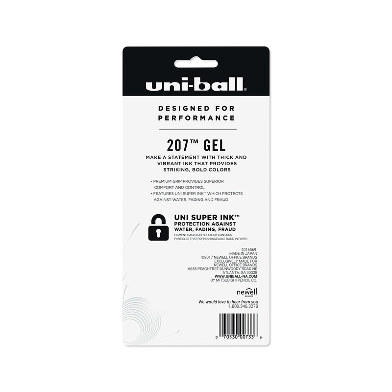 The uni-ball 207 gel pen features exclusive uni super ink which helps protect against water, fading and fraud. The specially formulated pigment based gel pen ink contains particles that form an indelible bond in paper- it can’t be broken... ever. The solid vivid colors of 207 gel pens deliver bold color every time you write. The textured rubber grip offers superior writing and control, while the retractable gel pen tip provides added convenience. Adorned with distinct metallic accents, this uni-ball pen adds a touch of class to everyday life. Whatever you’re working on, you’re bound to shine with the uni-ball 207 gel pens.