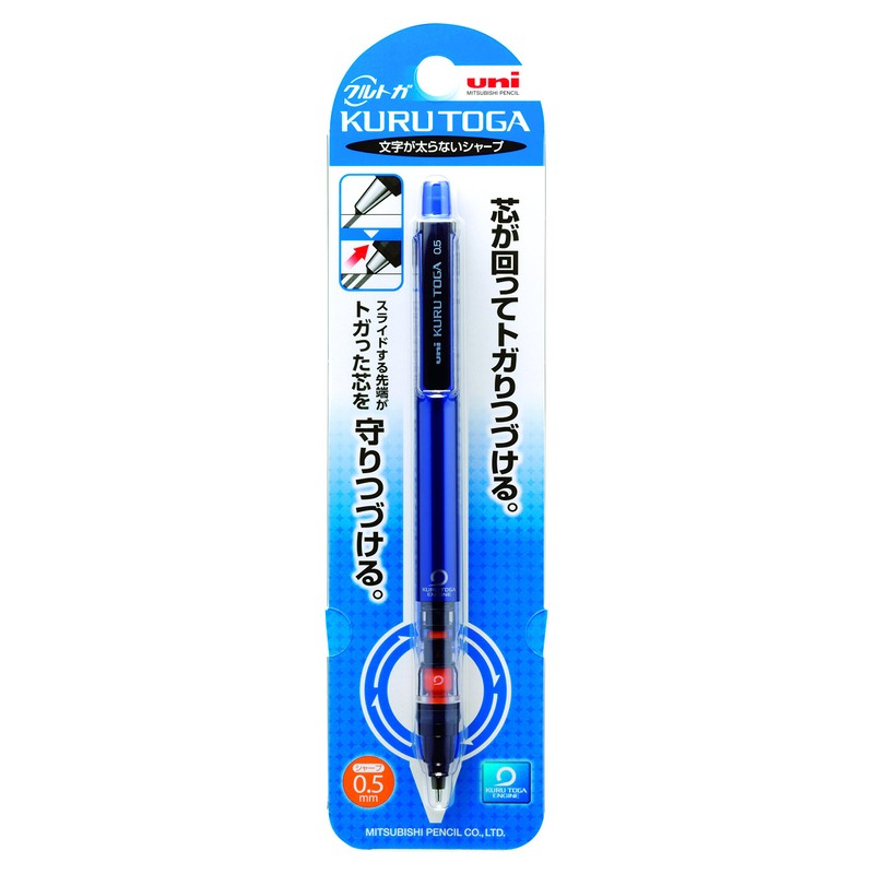 The Kurutoga has a core rotation mechanism that continually rotates the pencil lead as you write. A spring-loaded clutch twists the lead incrementally every time you lift the pencil from the paper. This allows a uniform wearing of the lead so that it always remains pointed. This is great for students! It gives you an amazingly thin line. In effect, you use only 50% of the lead area that you were previously using with your old mechanical pencil. In addition, this new Kurutoga is equipped with a pipe slide system.The lead is difficult to break as you write, due to the innovative mechanism. When the core is reduced, the pipe gets shorter at the same time. The guide pipe protects the entire length of the lead. Because there's no lead breakage, your papers remain clean without smudges from broken lead dust.
