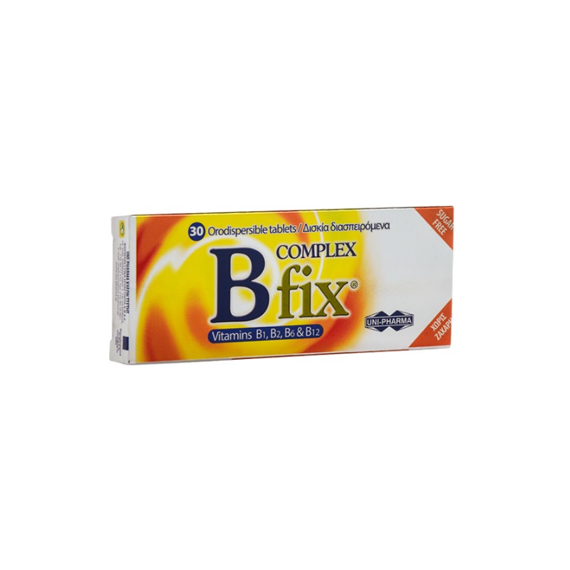 Uni-Pharma B Complex Fix is a dietary supplement that contains B-complex vitamins. B vitamins are essential for the health and normal functioning of the nervous system and metabolic processes that aim to produce energy. Also, complex B and especially B1, B6 and B12 benefit from normal mental function and help reduce fatigue and tiredness.