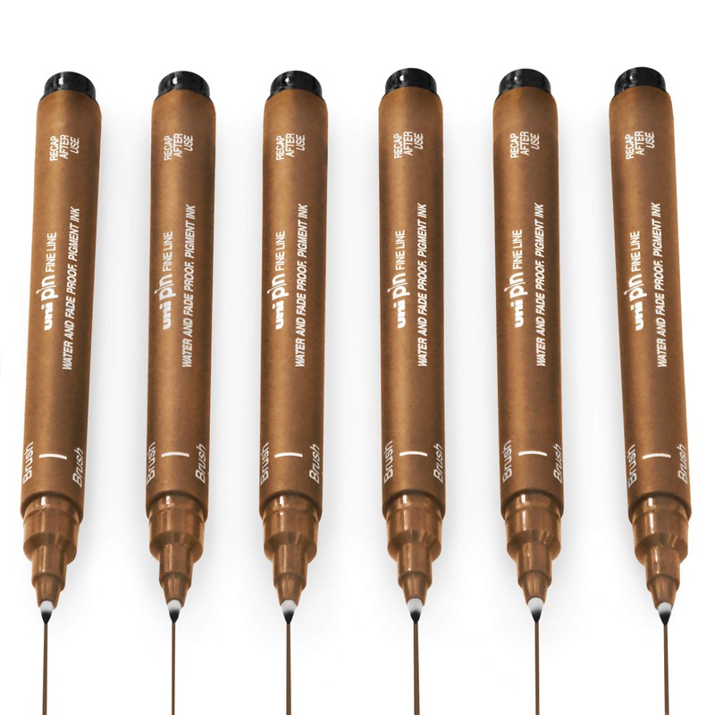 Uni Pin Fineliner Drawing Pen - Sepia Ink - Brush Nib - Pack of 6