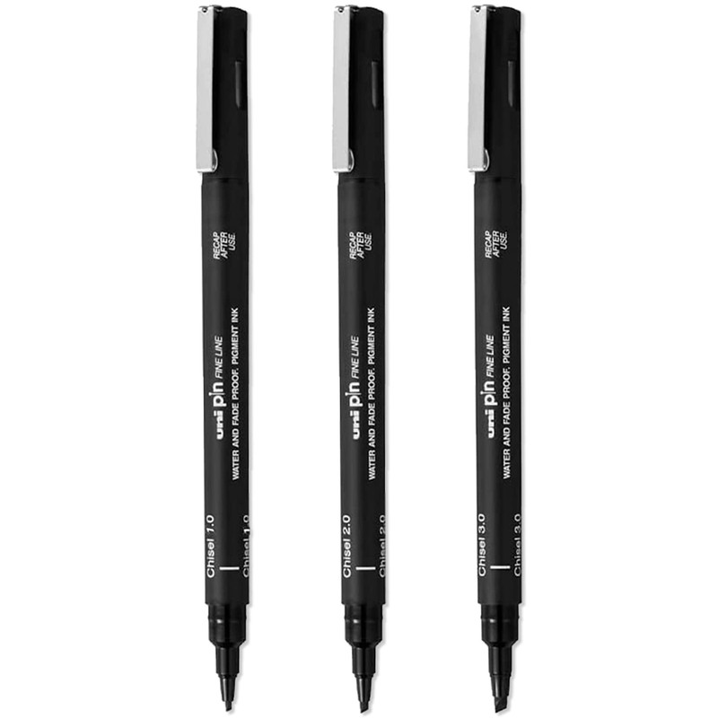 Uni Pin Fineliner Drawing Pens - Chisel Nibs - Black Ink - 1.0mm 2.0mm 3.0mm - Assorted Pack of 3
