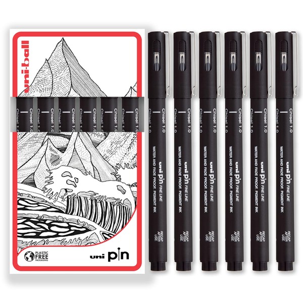 Uni Pin Fineliner Drawing Pens - Chisel Nibs - Black Ink - 1.0mm Nib - Pack of 6 - In Gift Box