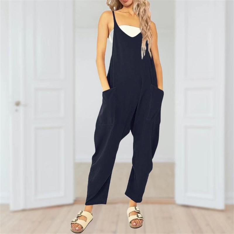 UNIANKIYA - Monos largos de una pieza para mujer, cuello en V, sin mangas, ajuste holgado, tirantes delgados, harén con bolsillos, Azul oscuro, S