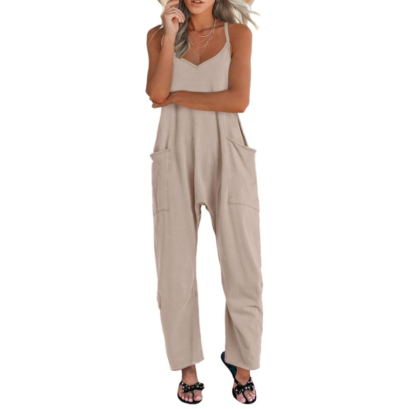 - FEATURES: Adjustable one piece jumpsuits for women.Deep v neck; Comfy & Baggy overalls; Wide leg long harem pant rompers for women; Loose fit design; Two big side pockets; Low crotch; Solid color; Lounge sleeveless jumpsuit with adjustable spaghetti strap