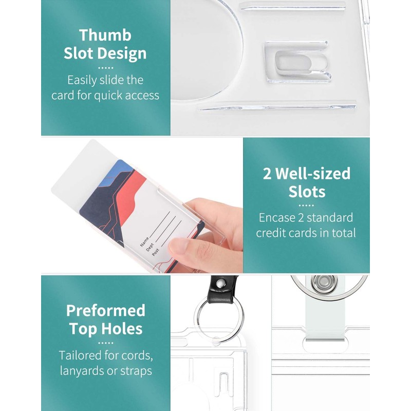Uniclife Vertical ID Card Holder for 2 Cards with Thumb Slots, Hard Transparent PC Case Protector with Retractable Badge Holder Carabiner Clip for Credit Cards, Pack of 5