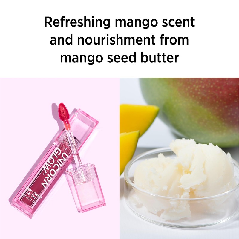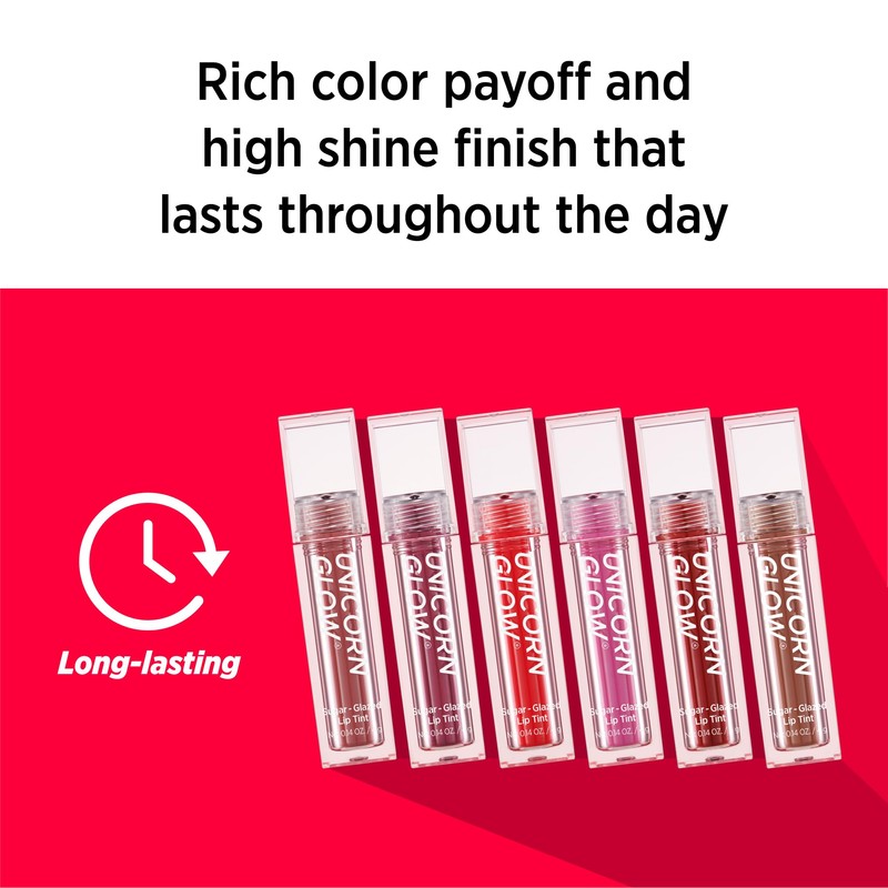 Available in six gorgeous shades, Unicorn Glow Sugar-Glazed Lip Tint delivers a rich color payoff in a luminous, juicy shine that intensifies over time.