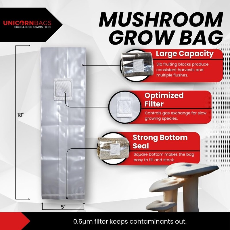 Unicorn Bags 10A OxoD Mushroom Grow Bag Small Polypropylene 5” x 4” x 18” 0.5 Micron Filter Biodegradable (50)