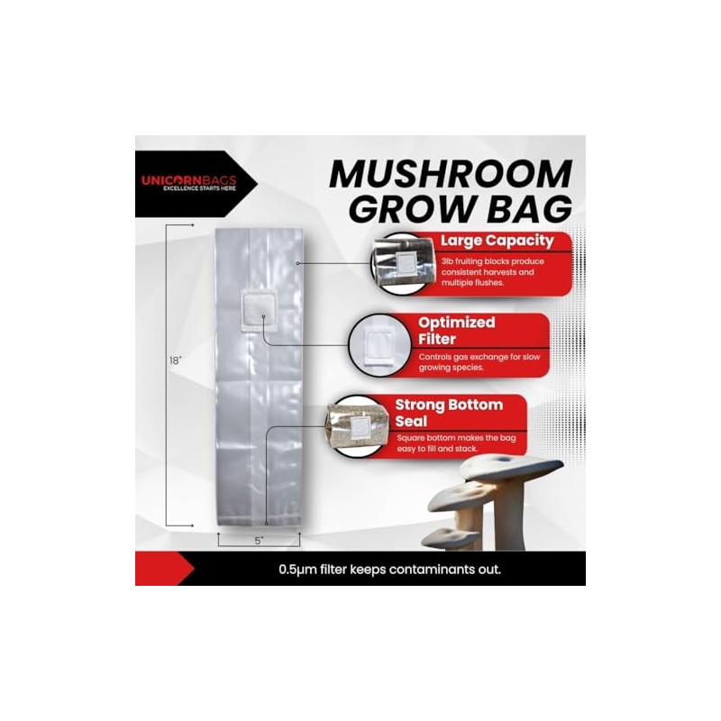The Unicorn Bags 10A OxoD is a top-quality polypropylene bag designed for growing gourmet mushrooms which grow best in high CO2 environments. Made with a 0.5 micron, low surface area type A filter, this bag is engineered to moderate gas exchange and control humidity while keeping out contaminants. This makes it ideal for varieties such as button, shiitake, and pink oyster which prefer higher CO2 levels during their spawn run and maturation.