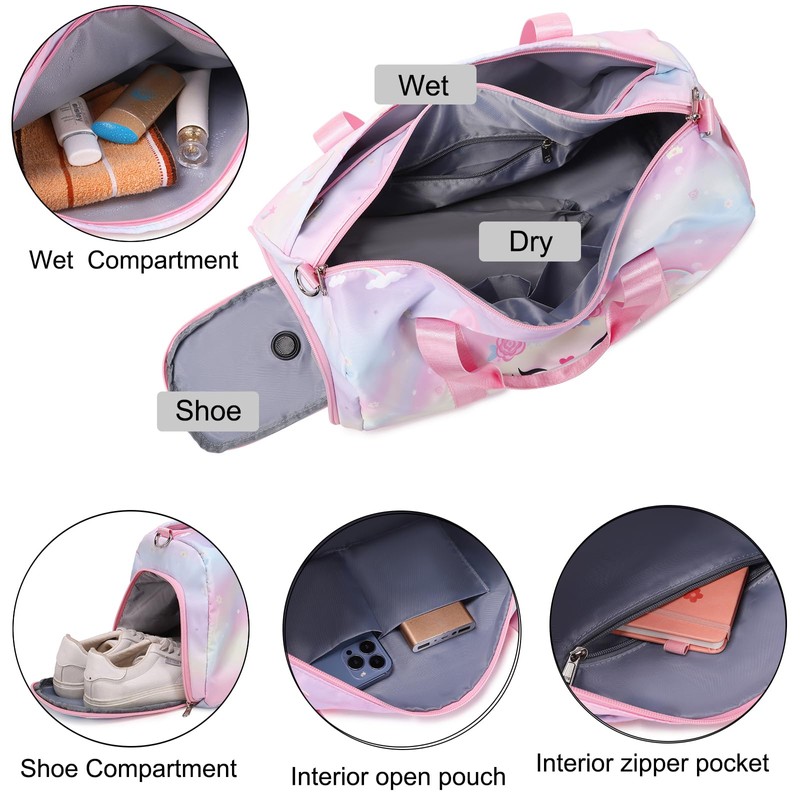 - Girls Travel Bag with Dry Wet Separated - Adorable girls ballet dance gymnastics bag weekender bag also have a large wet compartment which protect your belongs well from rain or wet.Put dirty stuff inside it after exercise ,such as swimsuit, wet towels, toiletries or dirty clothes.