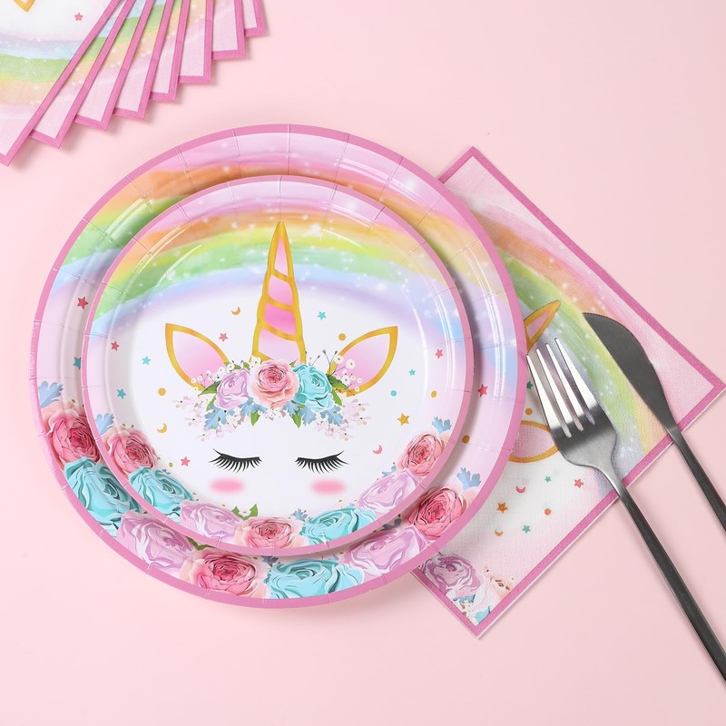 - 🦄Perfect Party Decorations - Perfect for large gatherings, this party set makes it easy to entertain up to 24 guests. In each unicorn set, you'll have everything you need for your celebration: 24 unicorn party birthday plates (24 * 9inch), 24 dessert plates (24 * 7inch), 24 unicorn cups, and 25 soft, absorbent unicorn napkins.