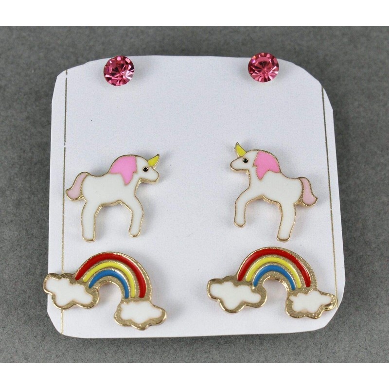 Unicorn rainbow 3 pair earrings crystal bead stud post set pack pink