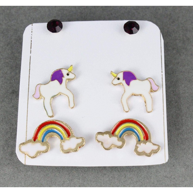 Unicorn rainbow 3 pair earrings crystal bead stud post set pack purple