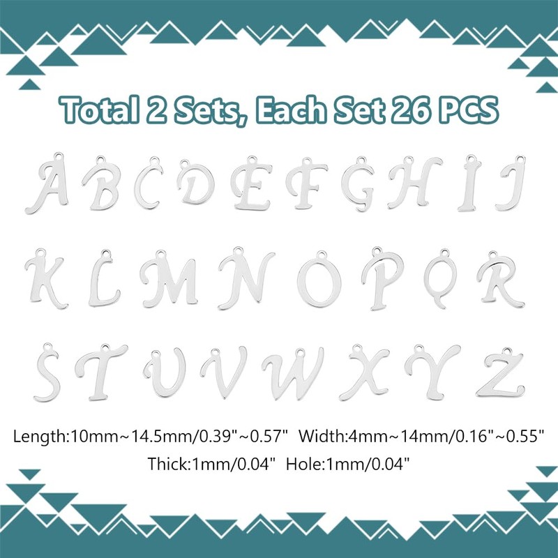 - Size : The alphabet pendants wide is about 10-13mm,long is about 6-14 mm, hole is about 1mm, 26pcs/set, 2 set,52pcs;Easy for you to link these charms with other things