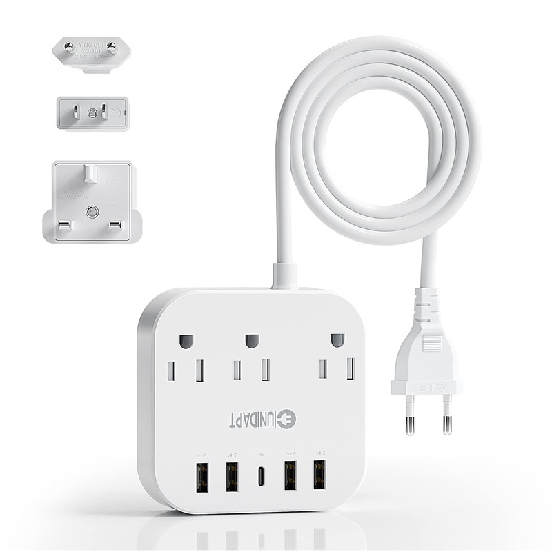 European Plug Adapter, Unidapt US to UK Europe Power Strip for EU/UK/US with USB C and 4 USB Ports, 3 AC Outlets, Wall Mountable, 5ft Extension Cord, for Travel Cruise Ship Home
