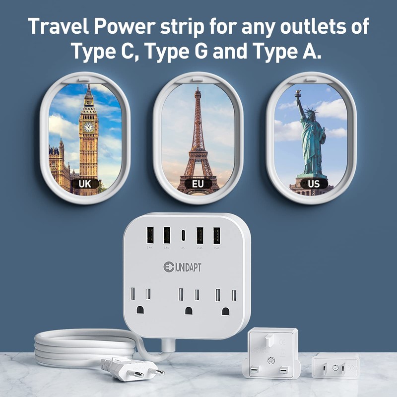 - Universal Plug Adapter for Travel or Home - Comes with 3 different types of International plugs - EU (Type C), UK (Type G), US (Type A), these types are compatible with most of the world. Type C works in almost all of Europe, Type G works in UK, Ireland, Dubai and much more, Type A is for USA, Canada, Mexico and so on. Use as both a travel adapter and power strip for your home/office