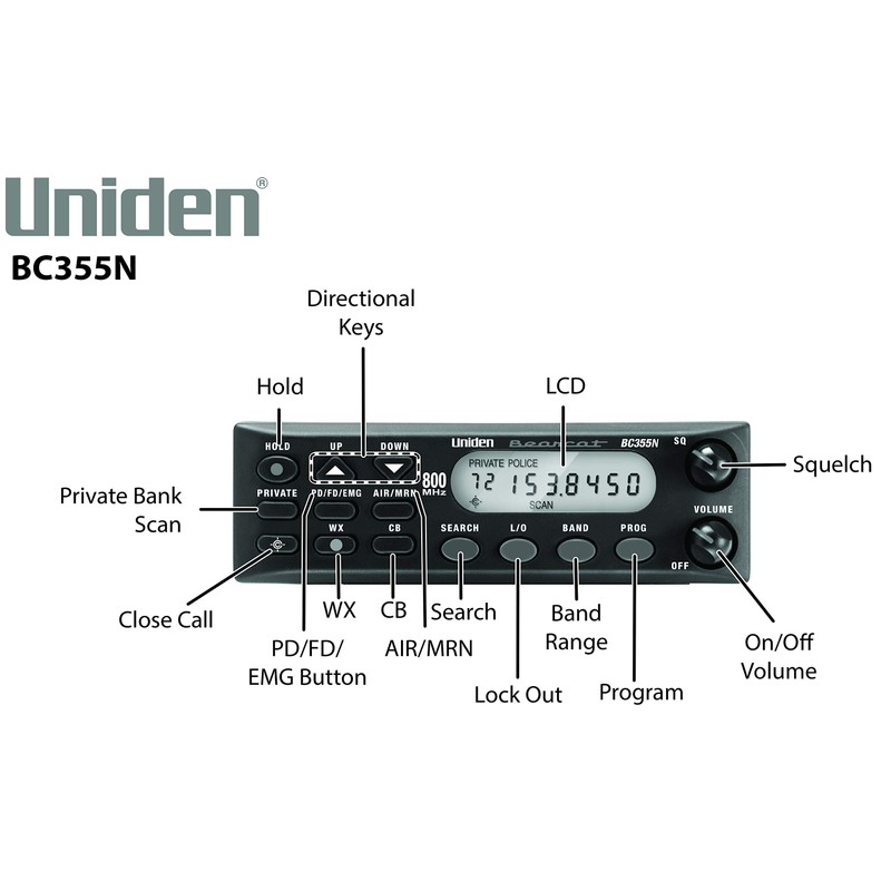- The Uniden Bearcat BC355N Mobile/Base Scanner is one of the most feature packed, user-friendly, entry level scanners available today. It can pick up analog receptions including 6 Service banks for monitoring Police, Fire, Emergency Medical Services, Marine, Air, Weather, and CB frequencies.