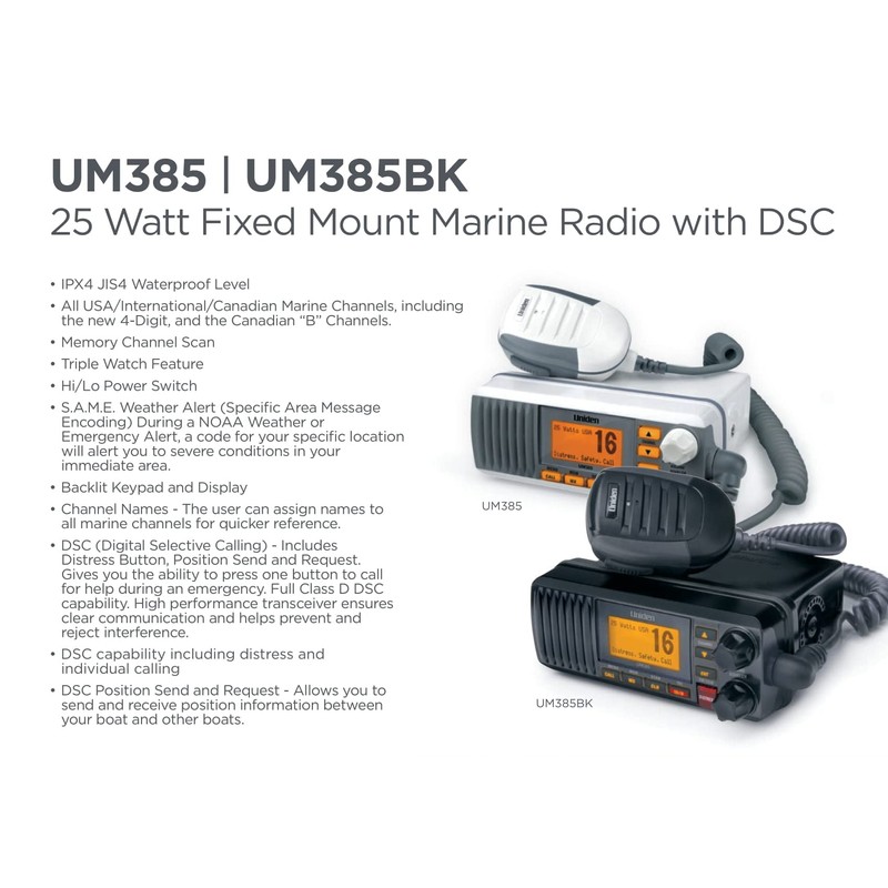 UM385 fixed mount VHF radio - Black Features: front panel designed Canadian Marine broadcast “B” channels International 4 digit channels mea 0183 in/out25 watt fixed mount Marine Radioipx4/JIS4 waterproof level memory channel SC an triple watch features/along power switches. A. M. E. Weather Alert - specific area message encoding backlit keypad and display channel name SD SC (digital Selective calling)distress, individual, urgency, safety, position report and send, DSC test call and menu selection for auto DSC channel switching triple watch plus compatible with Uniden mrn-gpsk GPS receiver
