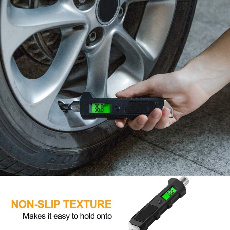 • Green Backlit LCD display and flashlight for visibility in dimly lit areas, ensuring easy measurement of tire pressure
