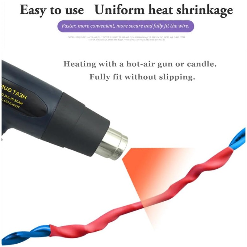 - 【EASY TO USE】Choose the appropriate size of the heat shrink tube, insert the wire into the tube, slide it to the required position, and heat it with a hot air blower or a candle until it wrap the wire or connector tightly.