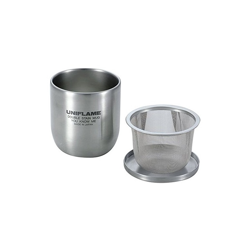 Beautiful form with Japanese style design. This is an authentic double stainless steel mug with a tea strainer and lid.