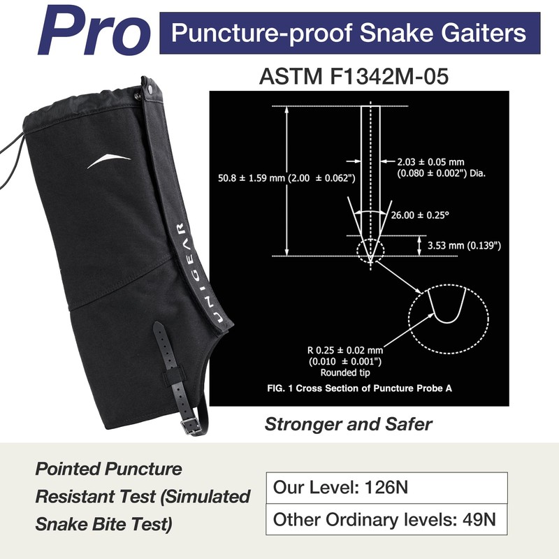 - Powerful Snake Protection: Unigear snake gaiters have been tested according to the ASTM F1342M-05, with a puncture resistance of up to 12850gf, far exceeding the 5000gf of PP board snake gaiters. It prevents simulated snake strikes with paired 0.05 mm sharpness instruments, with a weight of 150 grams and 0.59J, providing protection that surpasses the biting force of snakes (700-2000psi, 370-9900gf). It easily protects against cobras and provides ultimate protection in any environment.