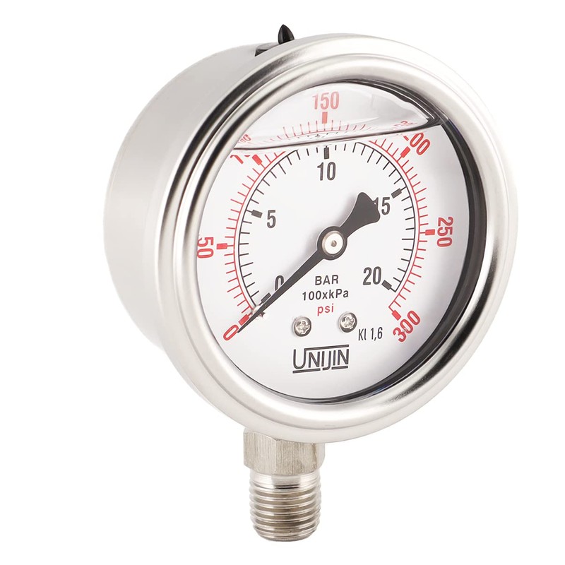Unijin P255 Series 2.5" Dial, Oil Filled Full Stainless Steel Pressure Gauge, 0-300 PSI/kPa, ±1.6% Accuracy, 1/4" NPT, Bottom Mount