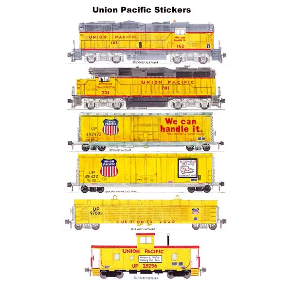 Union Pacific We Can Handle It Train 6 individual stickers by Andy Fletcher.  Stickers are reproductions of Union Pacific GP9, GP39, We Can Handle It 50' box car, Automated Railway 50' box car, coil steel car and caboose drawn by artist Andy Fletcher, designer of the Norfolk Southern Heritage Locomotives.  Stickers are approximately 1.25"x 3"-5".
