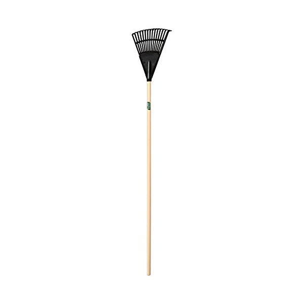 This shrub rake, designed for raking around flowers and shrubs, features 10 tines, an 8-inch fan-shaped polypropylene head, and a 48-inch tap-in hardwood handle.