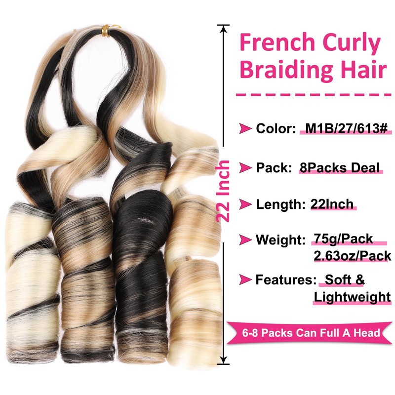 - Package : French Curl Braiding Hair is 75g/pack , 22 Inches long , 8 Packs/Lot,It is enough for a full head, This french curly braiding hair is super soft and silky ,The body wave braiding hair extensions can be long-lasting with good care.