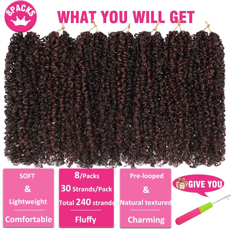 - Pre-twisted Yanky Twist Crochet Hair Specifications:Our Passion Twist Crochet Hair is 12 inches, there are 8 bags/batches, 30 strands/bag, a total of 248 strands, enough for you to complete a full fluffy and full hairstyle, and we have a lot of color choices, you can choose your favorite color to complete your fashion match. Believe that your charm will be more noticeable after completion, and thus get more compliments.