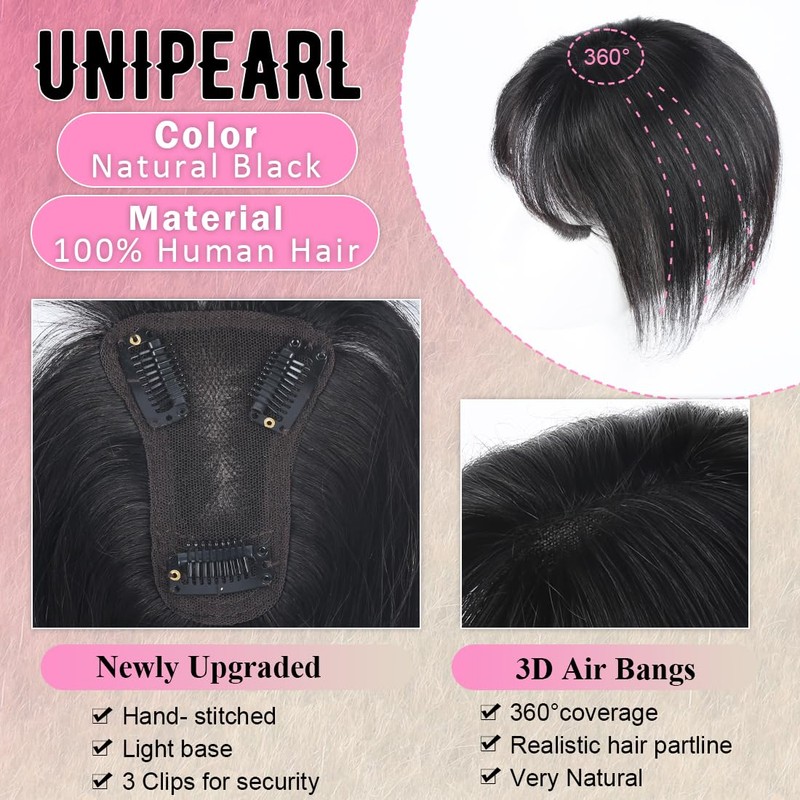 Unipearl Hair Toppers for Women Real Human Hair with Bangs 360°3D Straight Human Topper Clip in Bang Realistic Scalp with Hairpieces (1B# 8inch)