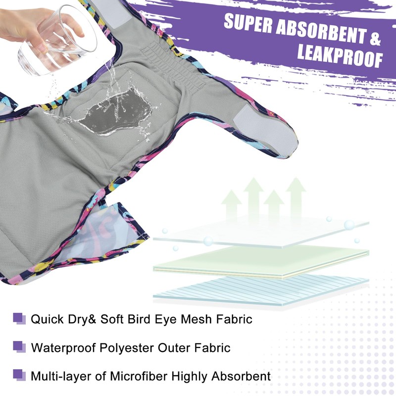 • High Absorbency and Leak-free - Designed with comfort in mind, these dog diapers have a sewn-in super absorbent pad to hold liquid in the pad, bird-eye mesh fabric against skin, and a leak-free exterior PUL shell to make doggie diapers totally leak-free.The comfortable contact lining of the dog underwear diapers protects your dog from blood and urine stains.