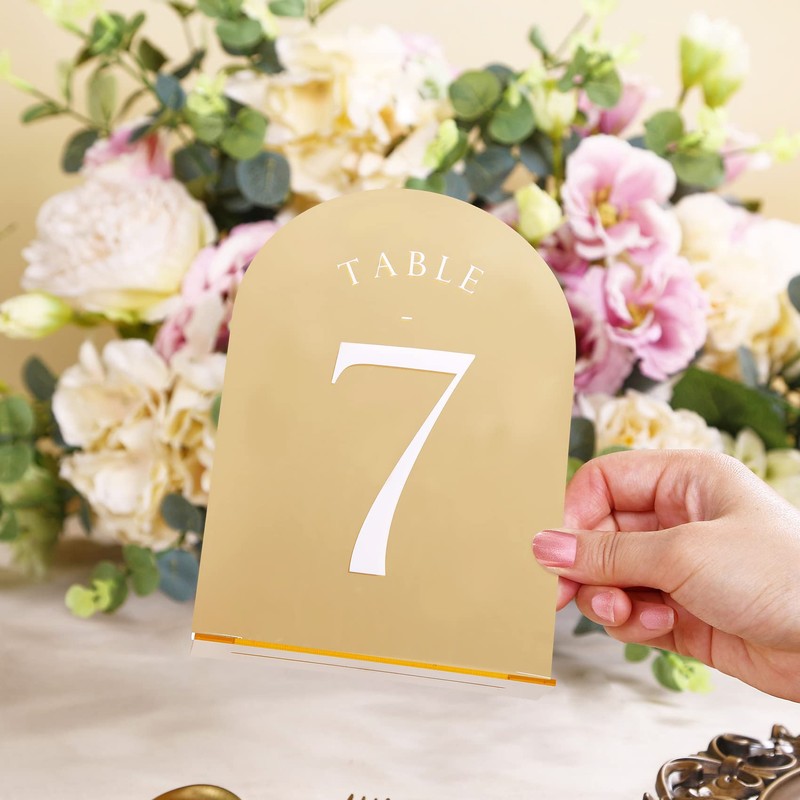 UNIQOOO Gold Mirror Arch Wedding Table Numbers with Stands 1-20, 5x7 Acrylic Display Signs and Holders, Pack of 20, Perfect for Centerpiece, Reception, Decoration, Party, Anniversary, Event
