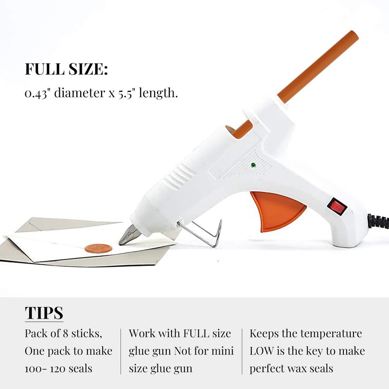 - Easy To Apply - Easily use together with a low-temp large standard 0.44" glue gun. Not designed for mini glue guns! If you plan to seal dozens of envelops, this is the most efficient method. To avoid the wax stuck to the stamp, you may put stamp on an ice pack in between every 4-5 impressions. Please remember the glue gun was designed for glue stick which requires a much higer melting temperature than the wax, so to keep the temperature low is the key.