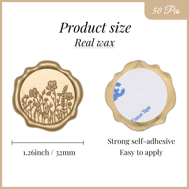 - PACKAGE INCLUDES - You will receive 50 pieces of light gold color wax seal stickers in 3D wildflower designs. The floral wax seal sticker diameter is 1.2 inches/31mm and with almost the same size of adhesive on the back. Weighs 0.02oz per seal and may add weight to envelopes.
