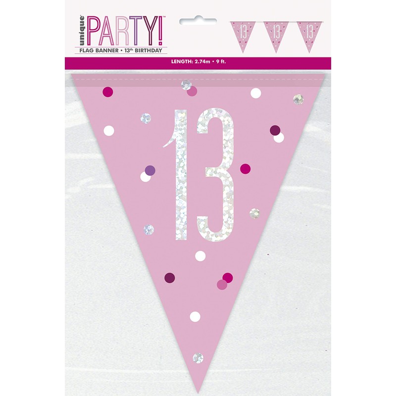 - PACKAGE INCLUDES: Pink and silver "13" plastic pennant banner - 9' - 1 Pc.
