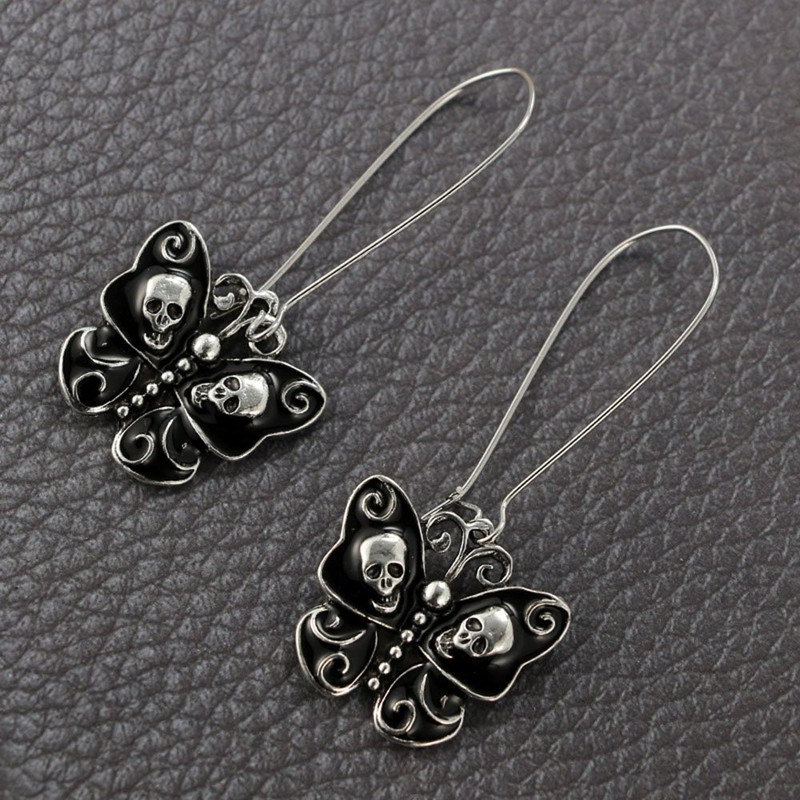 Unique Black Butterfly Skull Dangle Hook Drop Earrings