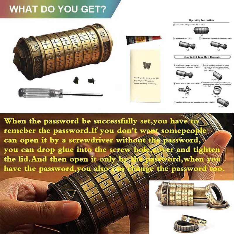 - 【Hidden Compartment Inside】: This puzzle cryptex has a hidden apartment inside. It’s big enough for small items such as secret notes, cash (including notes and small diameter coins), rings, jewelry, and keys. If you want to surprise someone, this is the best way of gifting them. People who receive this gift will definitely experience and enjoy the excitement of opening the mystery!
