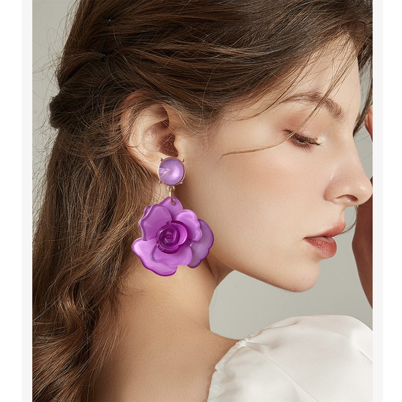 Unique Dainty Bohemian Luxury Oversize Resin Big Flower Dangle Drop Earrings Boho Big Flower Floral Petal Stud Earrings For Women Statement Crystal Jewelry Gifts (Purple)