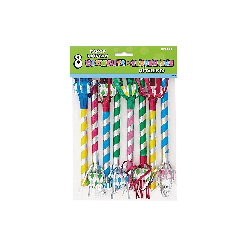 - PACKAGE INCLUDES: 8 fancy fringed party blowouts - 7.5" long