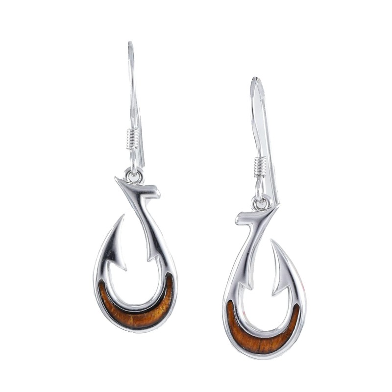 Unique Hawaiian Genuine Koa Wood 3D Fish Hook Earring, Sterling Silver Fish Hook Dangle Earring, E8924A
