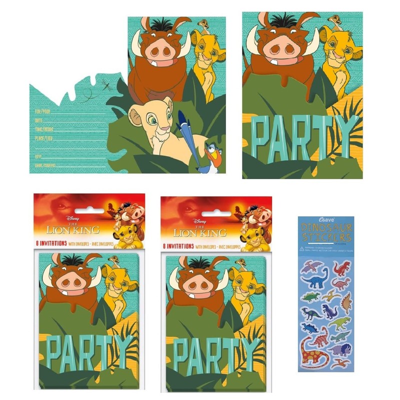 Lion King Party Supplies Bundle includes Party Invitations - 24 CountParty Invitations 24 Count and 1 Esave dinosaur sticker sheet (not Lion King stickers).